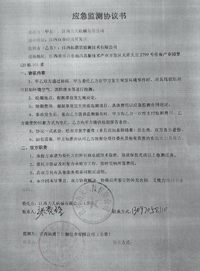 (2)江西力天機(jī)械有限公司外部救援機(jī)構(gòu)為政府職能部門及周邊企業(yè),一旦發(fā)生突發(fā)環(huán)境事件,通過信息傳遞需要實(shí)施外部救援時,相關(guān)部門及單位本著“以人為本,快速響應(yīng)”的原則,能迅速對本企業(yè)進(jìn)行應(yīng)急救援。
