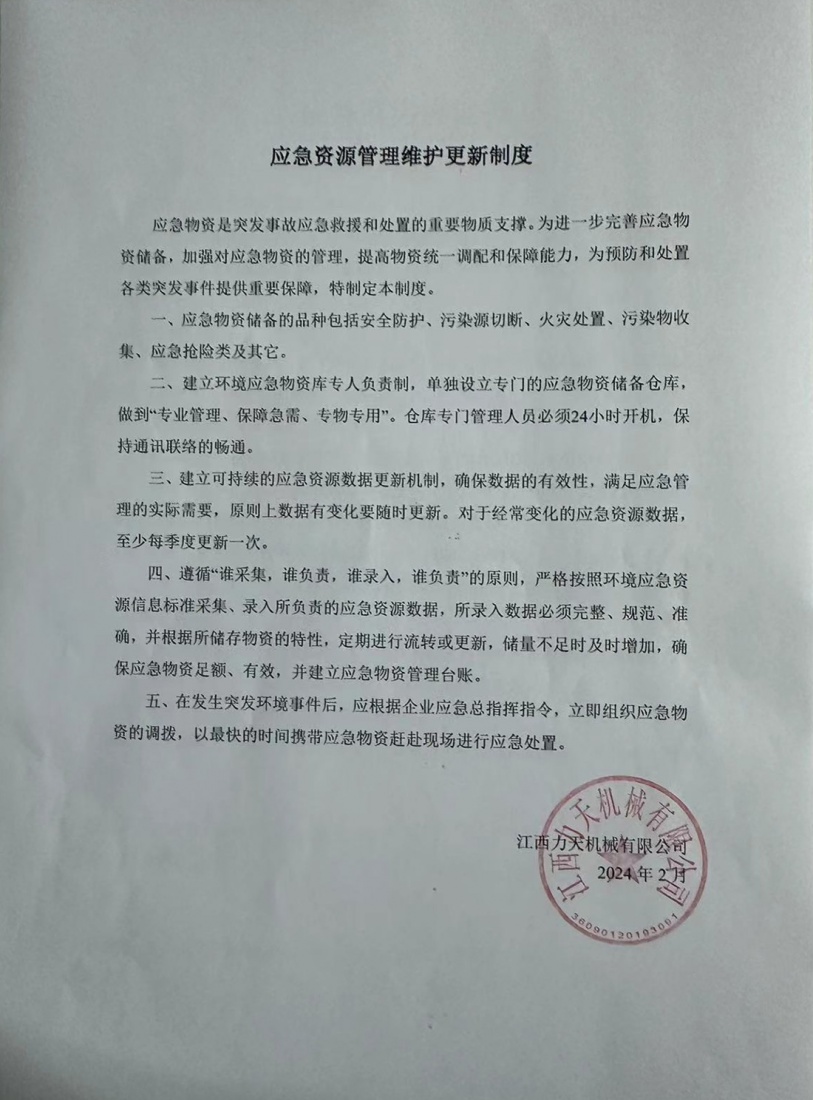 江西力天機(jī)械有限公司發(fā)生或可能發(fā)生突發(fā)環(huán)境事件時,第一時間可以調(diào)用的環(huán)境應(yīng)急資源情況,包括可以直接使用或可以協(xié)調(diào)使用的環(huán)境應(yīng)急資源,以及環(huán)境應(yīng)急資源的管理、維護(hù)、獲得方式與保存時限等。